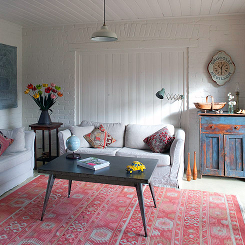 Early painted furniture and rare eclectic finds surround the comfy linen couches.