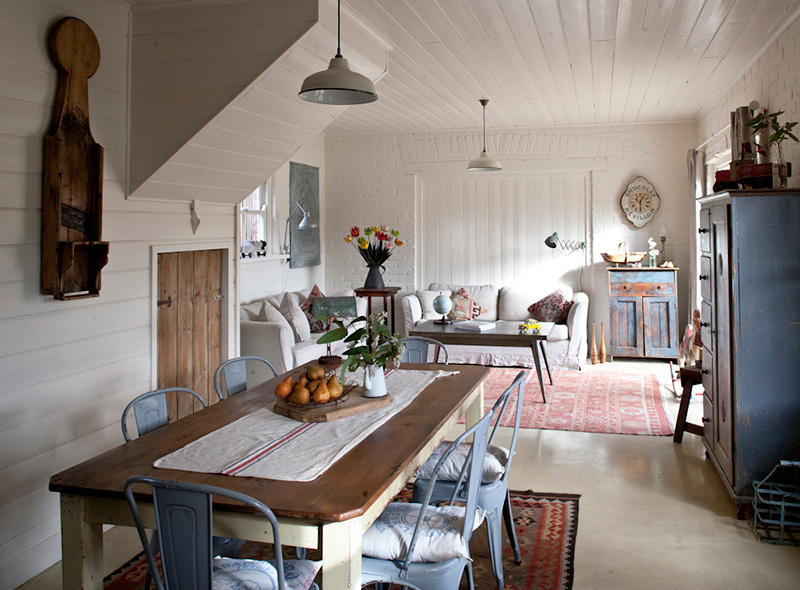 In the dining room of this fab little cottage there is an early-Australian table surrounded with rare 1920s French metal Tolix chairs, with access through French doors to the courtyard.