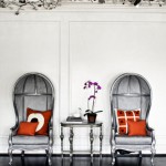 …an eclectic house and its equally eclectic owners…the living room, where the walls are covered with sunburst mirrors, some of the first items the Ukrainian-born former ballerina started collecting. In turn, the house is called La Maison de Soleil, and a crest, with rays emanating from the letter A (for Azria) has been printed on carpets, candles, and the directors’ chairs that overlook the outdoor tennis court. Max also has his own face emblazoned on poker chips and cards….”There’s a sense of humor about the place,” says Lubov, adding that she was inspired, in part, by Lewis Carroll’s Alice in Wonderland.